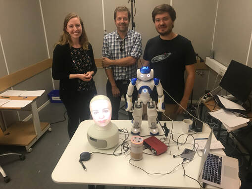 While at the KTH Royal Institute of Technology (Stockholm, Sweden) in September 2019, I met up with Dr. Jonas Beskow (pictured in the center), co-founder of Furhat Robotics, and Ph.D. student Patrik Jonell (pictured on the right). Together with Georgia Zellou and Taylor Kim, we’re conducting a study to test the role of embodiment and gender in human’s voice-AI interaction with three platforms: Amazon Echo, Nao, and Furhat.